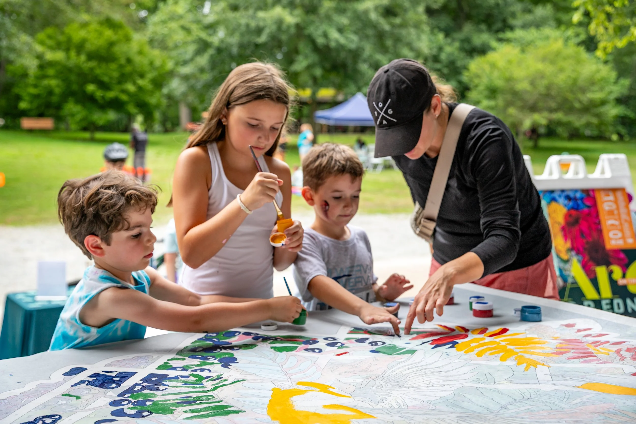 At the Community Art Picnic in Anson B. Nixon Park and the Yoga + Painting Workshop at Cypress Beach Park, participants joined Philadelphia-based muralist Kala Hagopian to co-create the Wild Medicine Eco Mural 23: Kennett Trails series. These hands-on experiences explored themes of biodiversity, pollinators, and our shared ecosystem, offering space for reflection, connection, mindfulness, and creativity.